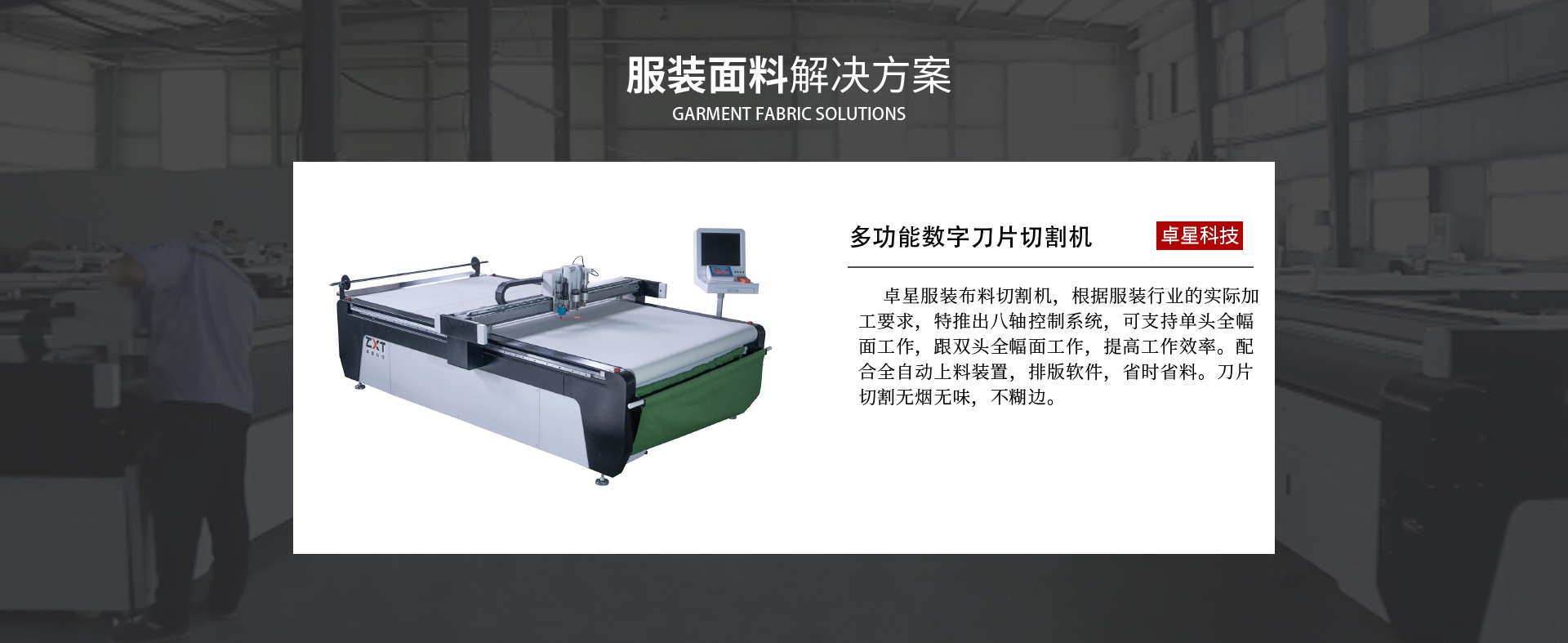 卓星服裝布料切割機,根據(jù)服裝行業(yè)的實際加工要求,特推出八軸控制系統(tǒng),可支持單頭全幅面工作,跟雙頭全幅面工作,提高工作效率。配合全自動上料裝置,排版軟件,省時省料。刀片切割無煙無味,不糊邊。